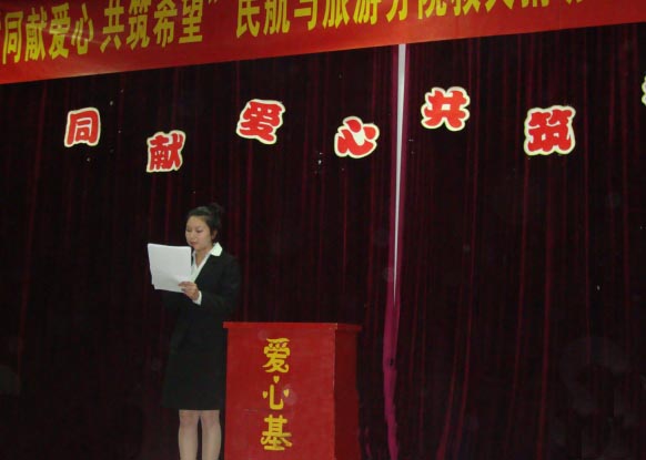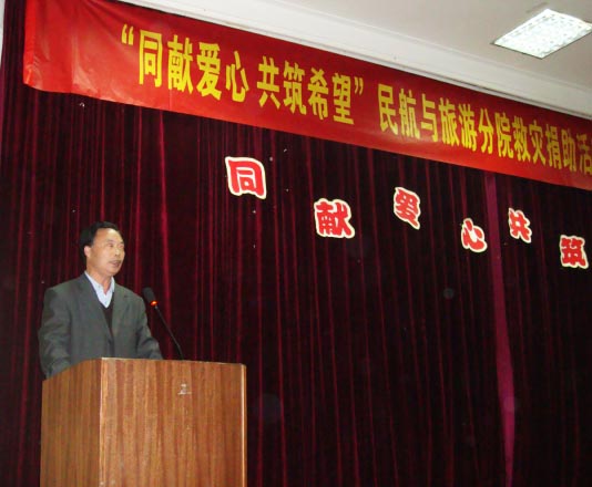 4月29日晚,“同献爱心,共筑希望”民航与旅游分院抗震救灾捐款活动暨爱心基金启动仪式在综合楼一楼报告厅举行。本次活动有幸邀请到了学院副院长、党委副书记周治斌老师出席,分院党总支副书记王贤军,班主任和学生代表参加了仪式。