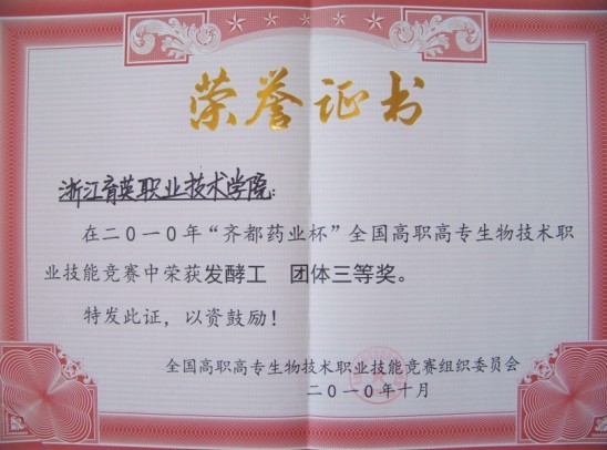 第三届全国高职高专生物技术技能大赛于10月29日、30日在淄博职业学院举行。大赛由教育部高等学校高职高专生物技术类专业教学指导委员会主办,淄博职业学院承办,齐都药业有限公司、化学工业出版社和高等教育出版社等单位协办。大赛有来自全国的61所院校的近300名学生参加,分两组(产品检验组和微生物发酵组)开展比赛,设置了理论知识、技能实训任务操作等竞赛内容。我院获得团体三等奖。 崔海辉