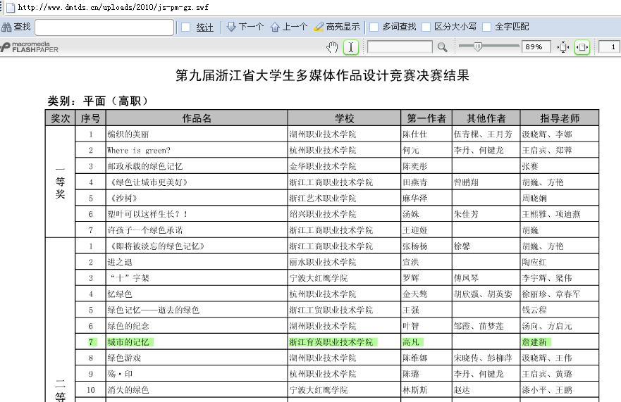 第九届浙江省大学生多媒体作品设计竞赛总共收到来自全省78所高校共计906件作品,其中平面作品的类型限于海报设计,主题为“绿色记忆”。参赛的平面作品有302件。经初赛专家评审后,选出决赛入围答辩作品33件,入围不答辩作品33件。入围答辩决赛于2010年11月12日在浙江传媒第二教学楼举行。最终经由决赛专家组投票与评议,信息技术与应用系08通信高凡同学的平面作品“城市的记忆”荣获二等奖。