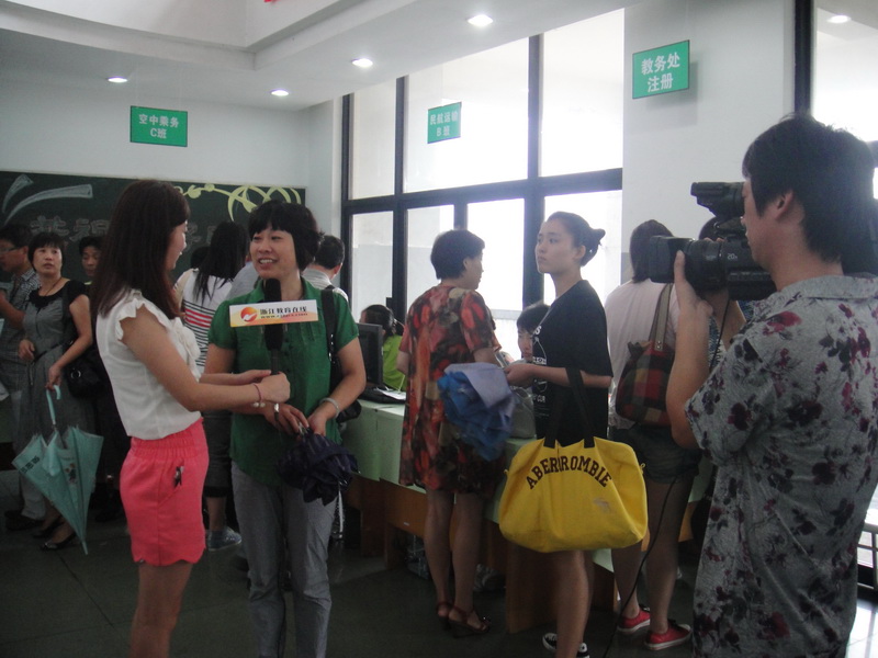 在新生报到处,老师们热情细心地给新生办理入学手续,新生们手整齐有序地排队办理。一对来自杭州的双胞胎姐妹由母亲陪着来报到,姐妹俩双双选择了市场营销专业,对于大学生活,她们怀揣美好的憧憬,也充满信心。