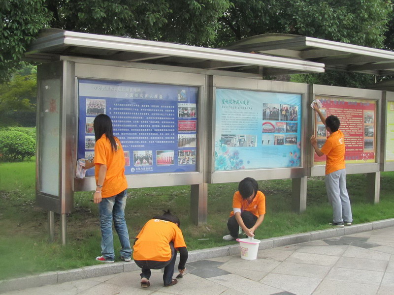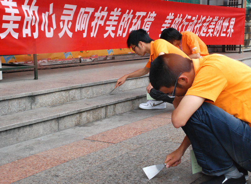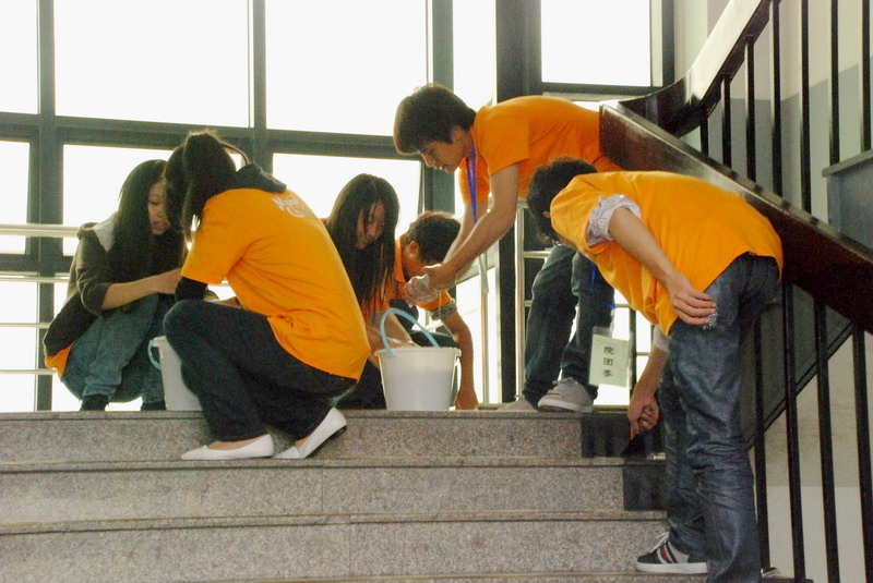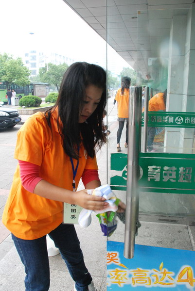 在清洁行动中,百名青年志愿者深入校园的每一个区域,擦洗宣传橱窗、清扫楼道、清理卫生死角、清除地面污迹,并开展了文明劝导宣传教育活动,引领全院学生掀起了“迎国庆、迎西博”,打造“最清洁校园”清洁大行动的高潮。广大师生不顾风雨、不辞辛劳,拿着扫帚、铁铲、抹布等工具,埋头苦干,认真清扫路面,擦洗花坛、座椅、果壳箱等洁具,清理楼道、校园杂物,清除牛皮癣,拾捡绿化带内有色垃圾,不放过一个烟蒂、不漏过一个死角。在清理学院临街店面及路面卫生时,广大师生还耐心地向店铺从业人员及过往行人作文明宣传,取得良好的效果。