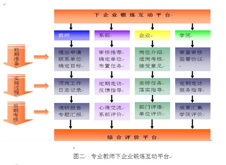 高职教师若是没有面向行业企业开展开发服务的意识、能力和经验积累,没有所从事教学专业对口的知识积累,或者不熟悉高职教育理念,不具备教学的能力,还是无法满足高职教育培养不可替代人才的要求。培养具“双教”能力的师资队伍,应由过去的“请企业走进学校”转变为“让老师走进企业”,对引进的教师必须要拥有在专业对口企业工作一定年限的经历,要实行专兼职教师“一对一”结对工程,每一位专业课教师都要结对一位企业兼职教师,作为课程设计、课程指导交流、应用研究的合作伙伴,形成利益共同体。对已有专业教师重点实行下企业锻炼制度,以保证其工程实践能力和对产业行业的了解。在制度设计上,下企业锻炼实行“政策导向,机制激励,任务明确,过程监控,全面评价,交流提高”,并建立专业教师下企业锻炼互动平台,见图二。