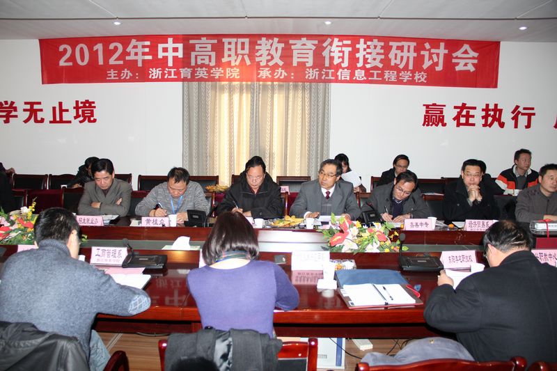 12月15日,我院2012年中高职教育衔接研讨会在浙江信息工程学校召开。金华实验中学、上虞职教中心、杭州人民职校、杭州旅游职校、萧山二职、平湖职业中专、嘉善中专、东阳第二职校、温州职业中专、杭州开元商贸职校、绍兴职教中心、浙江信息工程学校、杭州江滨职校等13所中等职业学校分管校长、教务处(招生办)负责人及相关专业教研组长(主任)参加会议。学院党委副书记、副院长周治斌,副院长秦学礼,教务处、招就办、各分院、系相关负责人及七个“3+2”专业教研室主任出席。会议由学院党委副书记、副院长周治斌主持。