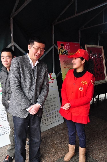 我院民航分院周丽欢、龚莎莎作为志愿者承担了杭州雷锋流动博物馆的讲解任务,赖书记看望了我院讲解志愿者,认真聆听了她们的讲解,还亲切地与她们进行了交谈。周丽欢现场接受了杭州电视的采访,视频在当天的杭州电视台现场直播。据了解,此前两位同学专门前往杭州市雷锋博物馆进行学习培训。另外,艺术系张剑斌、高榕等四位同学作为志愿者为行人现场在布袋上画雷锋画像,并送给行人,此举被领导们评价颇有特色和创意。