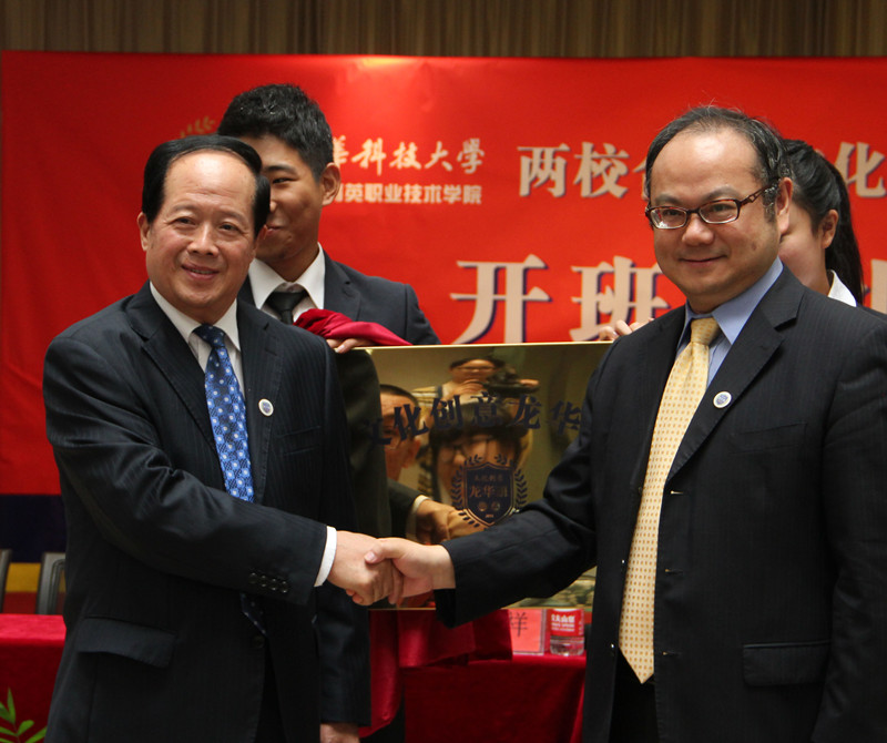 洪致平和葛自祥为文化创意龙华班揭牌,龙华班班主任和班长从两校校长手中接过班徽和班旗。