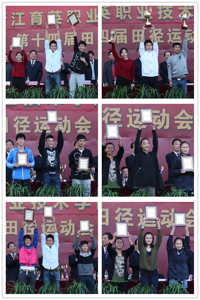 本届运动会中8人次6个项目破校运会田径记录。4人次4个项目破浙江省大学生运动会专科(乙组)田径记录,12营销B班曾俊杰同学在男子铅球项目中以12.5米打破12.31米的省大运会记录,13轨道A班曹晨敏同学在女子铁饼项目中以38.28米打破37.64米省大运会记录,13轨道A班曹晨敏同学在女子标枪项目中以36.25米打破35.55米的省大运会记录,13空乘B班赵晨丽同学在女子跳高项目中以1.53米打破1.51米的省大运会记录。1人次破1个项目浙江省大学生锦标赛专科(乙组)田径记录,13空乘B班李家鑫同学在男子400米项目中以51”07打破51”13的省锦标赛记录。3人次破3个项目院运动会记录,12航运A班冯刚杰51”48的成绩破学院男子400米记录,12航运A班冯刚杰以2’02”95的成绩破学院男子800米记录,13空乘B班李家鑫以2’04”50的成绩破学院男子800米记录。
