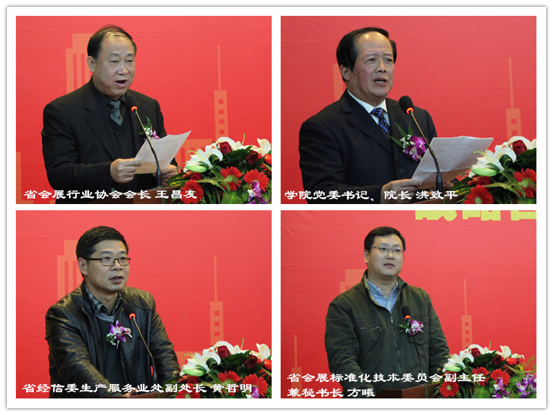 浙江省会展协会会长王昌友,学院党委书记、院长洪致平,浙江省经济与信息化委员会生产服务处副处长黄哲明,浙江省会展行业协会副会长兼秘书长刘志刚,浙江省会展标准化技术委员会副主任兼秘书长、浙江中汽会展有限公司总经理方曦,学院党委副书记、副院长周治斌,副院长陈六明王锡耀等领导出席。艺术设计与人文系主任宋连凯主持仪式。
