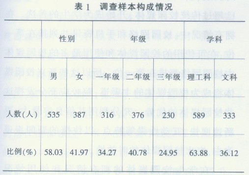 调查对象的性别比例为男生535人(占58.03%),女生387人(占41.97%);所在年级的构成情况为一年级学生316人(占34.270/0),二年级学生376人f占40.78%),三年级学生230人(占24.95%);学科为理工科学生589人(占63.88%),文科学生333人(占36.12%),详见表1。