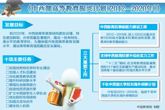 本报北京5月22日讯(记者 高靓)“到2020年,中西部高等教育结构更加合理,特色更加鲜明,办学质量显著提升,建成一批有特色、高水平的高等学校……”今天,由教育部、国家发改委、财政部联合印发的《中西部高等教育振兴计划(2012—2020年)》正式向社会公布。