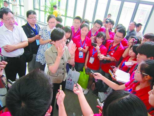 “鲁部长!鲁部长!”原本安静地等待着的我们瞬间欢腾了起来,蜂拥般地围住了国家教育部副部长鲁昕女士。