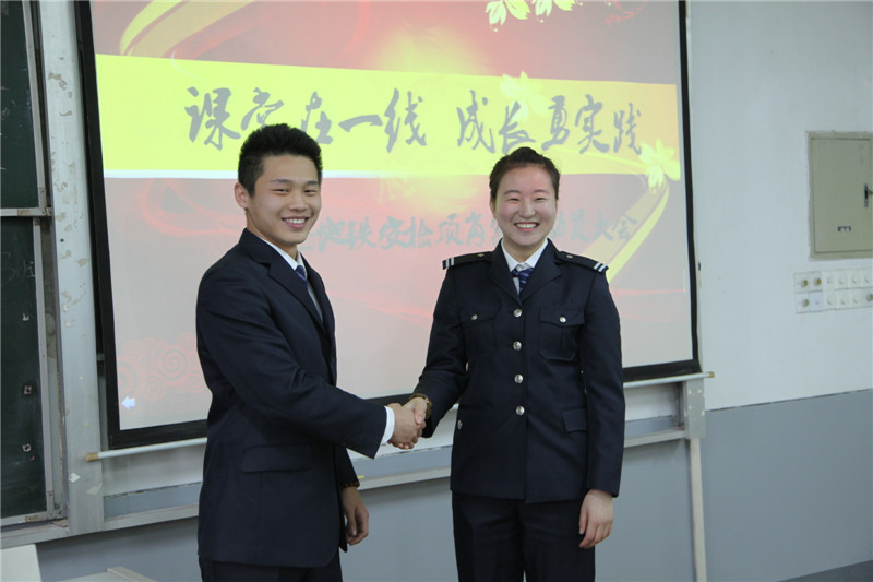 即将踏上实习岗位的安检班代表俞婷华和轨道班学生代表谢罗忠在会上发言,表示有决心、有信心完成实习工作,并通过握手的方式表示,在未来的四个月实习中,两个班级将在岗位上团结互助、共同奋进,为杭州市民出行提供优质、安全服务。