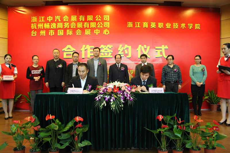 方曦、赵建和王锡耀分别代表浙江中汽会展有限公司、台州市国际会展中心和学院签订合作协议,与会嘉宾上台见证签约仪式。