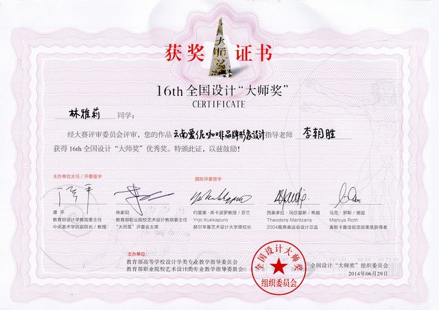 近日,收到第16届全国设计“大师奖”获奖证书,艺术系学生林雅莉的毕业设计作品《云南爱伲咖啡品牌形象设计》获优秀奖,艺术系李朝胜老师获指导老师奖。本届大赛由教育部高等学校设计学类专业教学指导委员会、教育部职业院校艺术设计学类专业教学指导委员会主办,同济大学设计艺术研究中心、中国设计教育网承办;中国工业设计协会、中国教育电视台、全国高校创意总部浙商建业有限公司、东阳中国木雕城等单位支持。