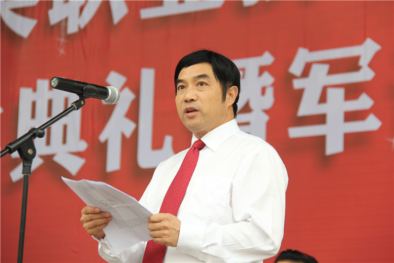 王锡耀给军训团授军旗,军训团团长章四海庄重地接过军旗。
