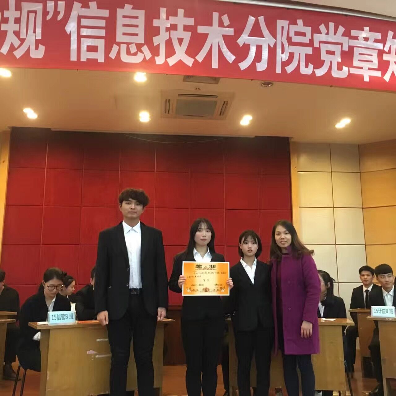 2016121日晚,“知党章、懂党规”信息技术分院党章知识竞赛圆满结束。本次比赛分初赛和决赛,初赛面向分院大一大二全体学生,以笔试的形成进行,最终进入决赛的代表队是15计应A,15计应B,15信管A,15信管B,16信管B,16计应3+2B,16网络,16通信。