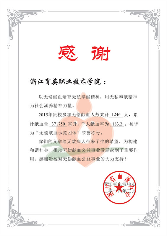 学院2016年荣获在杭高校“无偿献血示范团体”称号