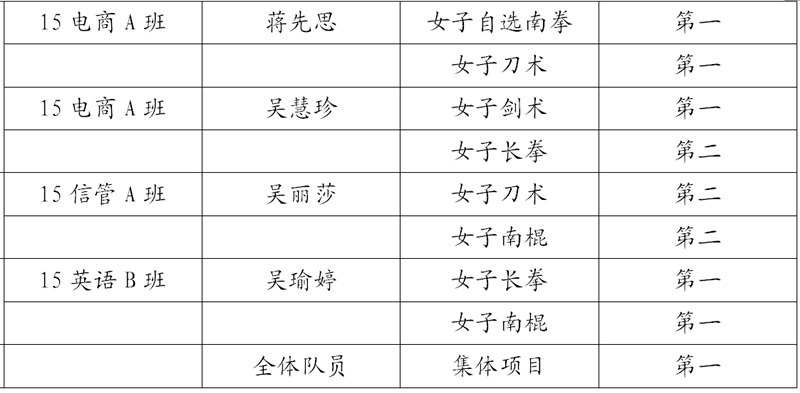 经过两天激烈比拼,我院武术队10名队员最终获得13金5银1铜的优异成绩,并再次蝉联男团、女团、总团冠军,同时季勋龙被评为“优秀教练员”。领队:莫智千,教练:季勋龙、许洲。