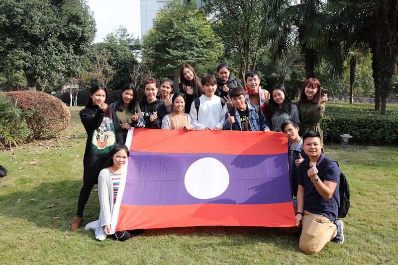 会后,谢鑫提议,让留学生携带老挝国国旗,在校园合影留念,祝福他们的祖国老挝“节日快乐”。