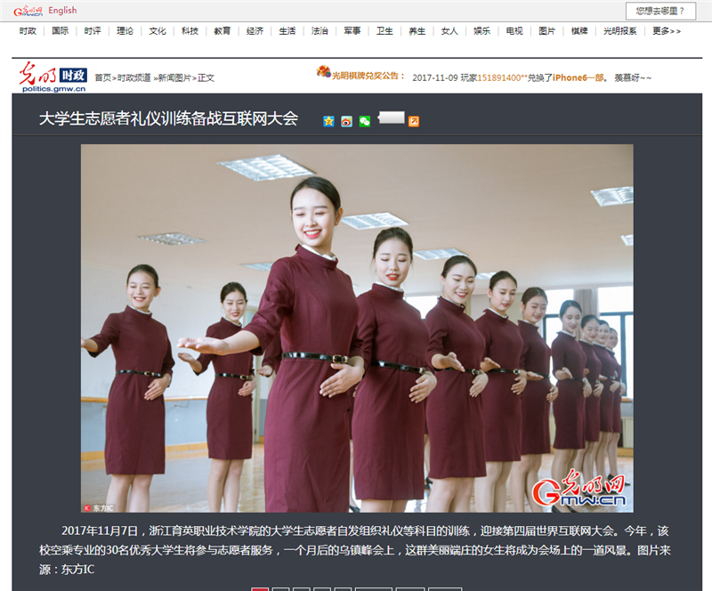 11月8日,浙江新闻客户端、浙江在线报道了我院空乘专业学生志愿者备战第四届世界互联网大会,光明网、新浪网等媒体转载。