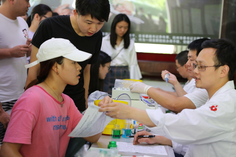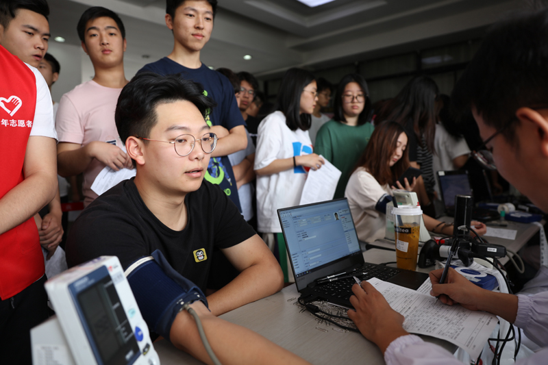 在无偿献血活动正式开始前,已有学生早早来到等待献血,采集登记处很快便排成了一条长龙。在医护工作人员和院青年志愿者的协助下,填表、化验、等候、抽血、休息,一切工作都有条不紊。