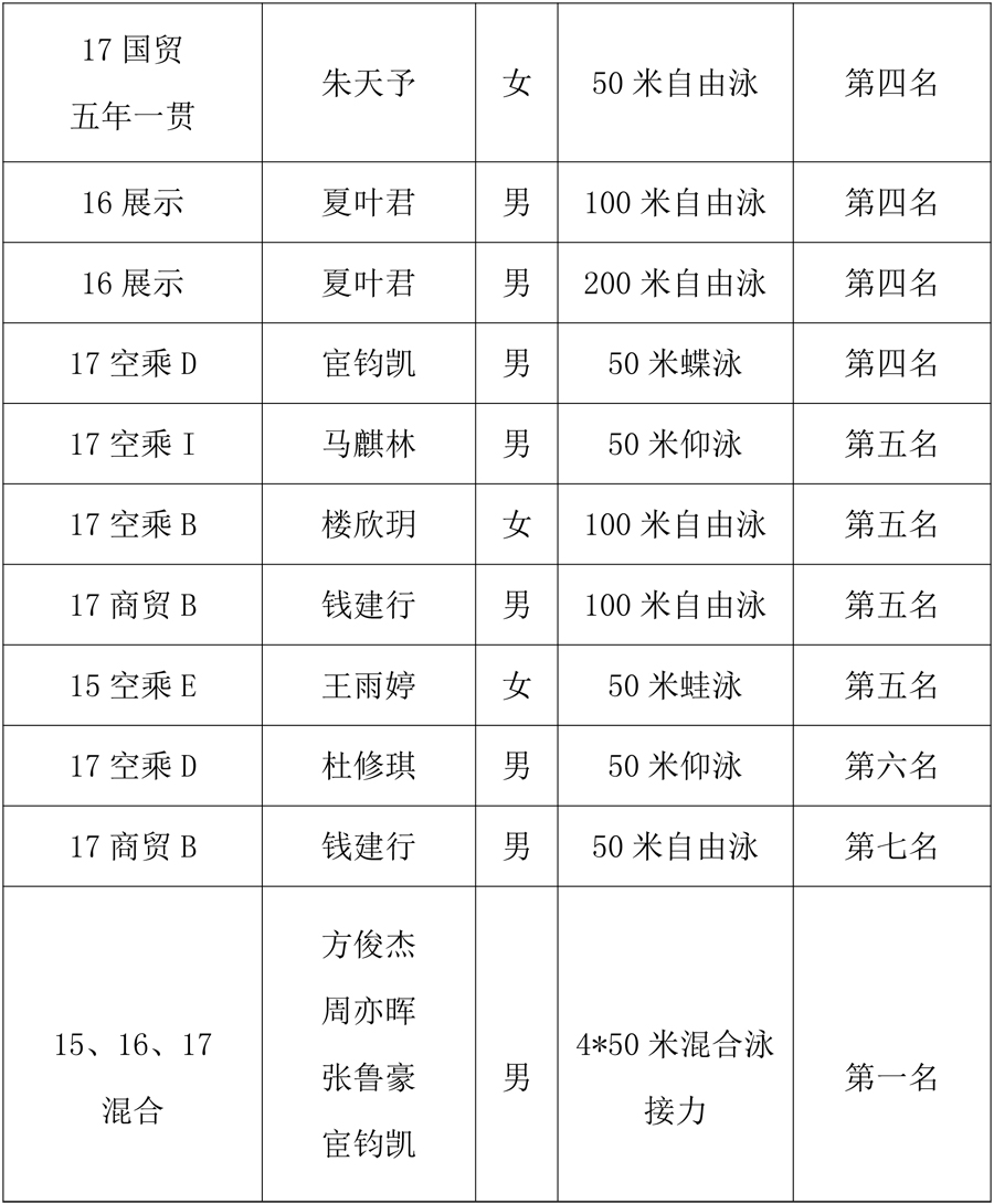 2018年5月31日-6月3日,2018年浙江省大学生游泳锦标赛在浙江财经大学举行,我院游泳队一举斩获7金3银6铜,总团冠军、男团冠军、女团季军,学院获体育道德风尚奖,楼俊毅获“优秀教练员”称号,王雨晶、王雨婷获“优秀运动员”称号。领队徐晓斌、主教练赵佳子、教练员楼俊毅。