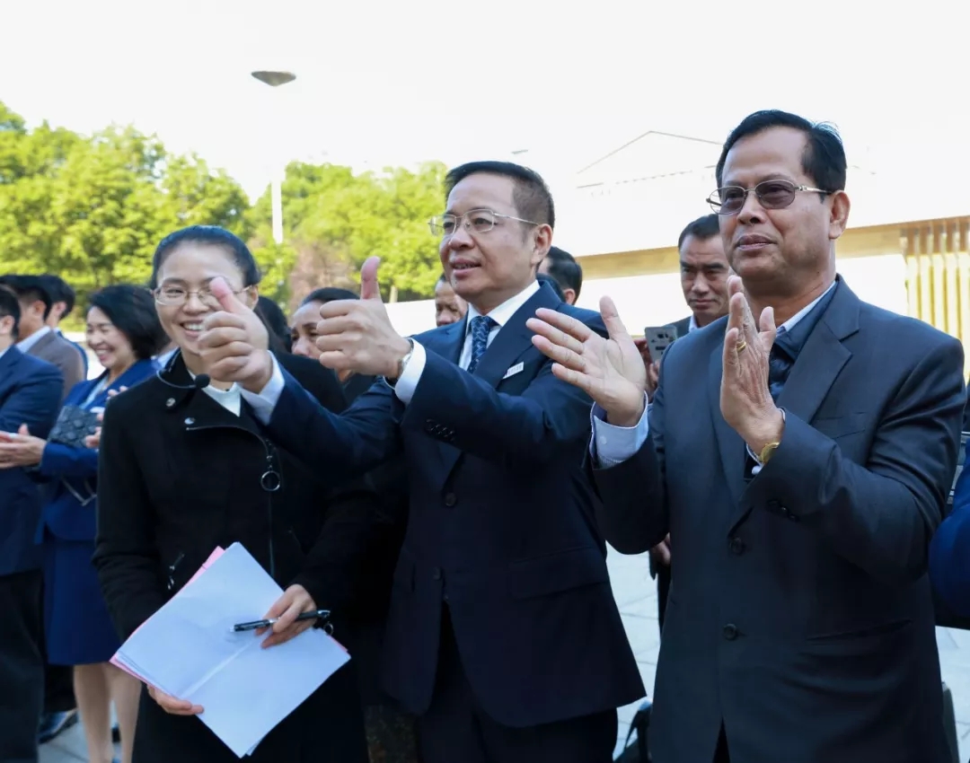 考察团一行一下车就受到育英师生热烈欢迎,他们欣赏了老挝留学生表演的老挝民族歌舞、中国歌舞、中国传统文化及职业技能展示等节目,对老挝留学生的成长进步表示高度赞赏。贡通·蓬维吉对老挝留学生发表讲话,表扬他们在中国只有两年半就可以把中文说得这么好,觉得非常惊讶,说他们真的很棒,希望他们在未来的日子里继续努力学习,把优秀的中国文化带回老挝,毕业后为中老两国的发展做贡献。贡通·蓬维吉一行还欣然与全体老挝留学生合影留念。