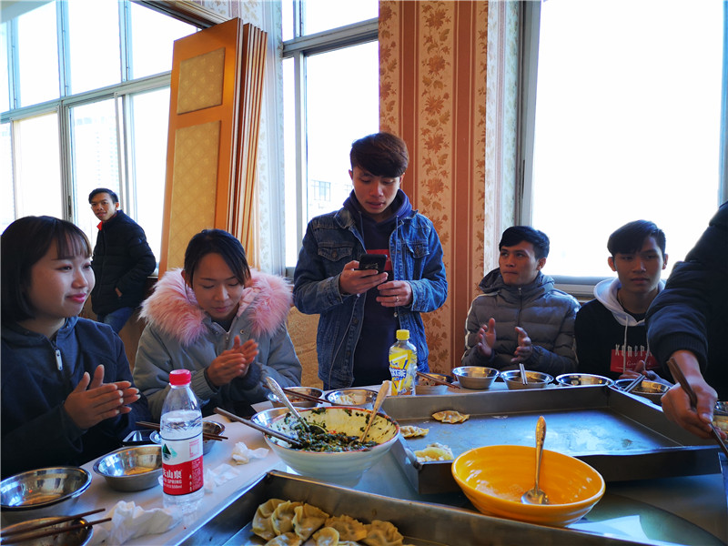 虽是隆冬时节,但大家热情不减,每位留学生都大显身手,包出了形状各异的专属水饺。活动的最后,老师和学生们围坐在一起,边吃边聊,现场充满了欢声笑语。
