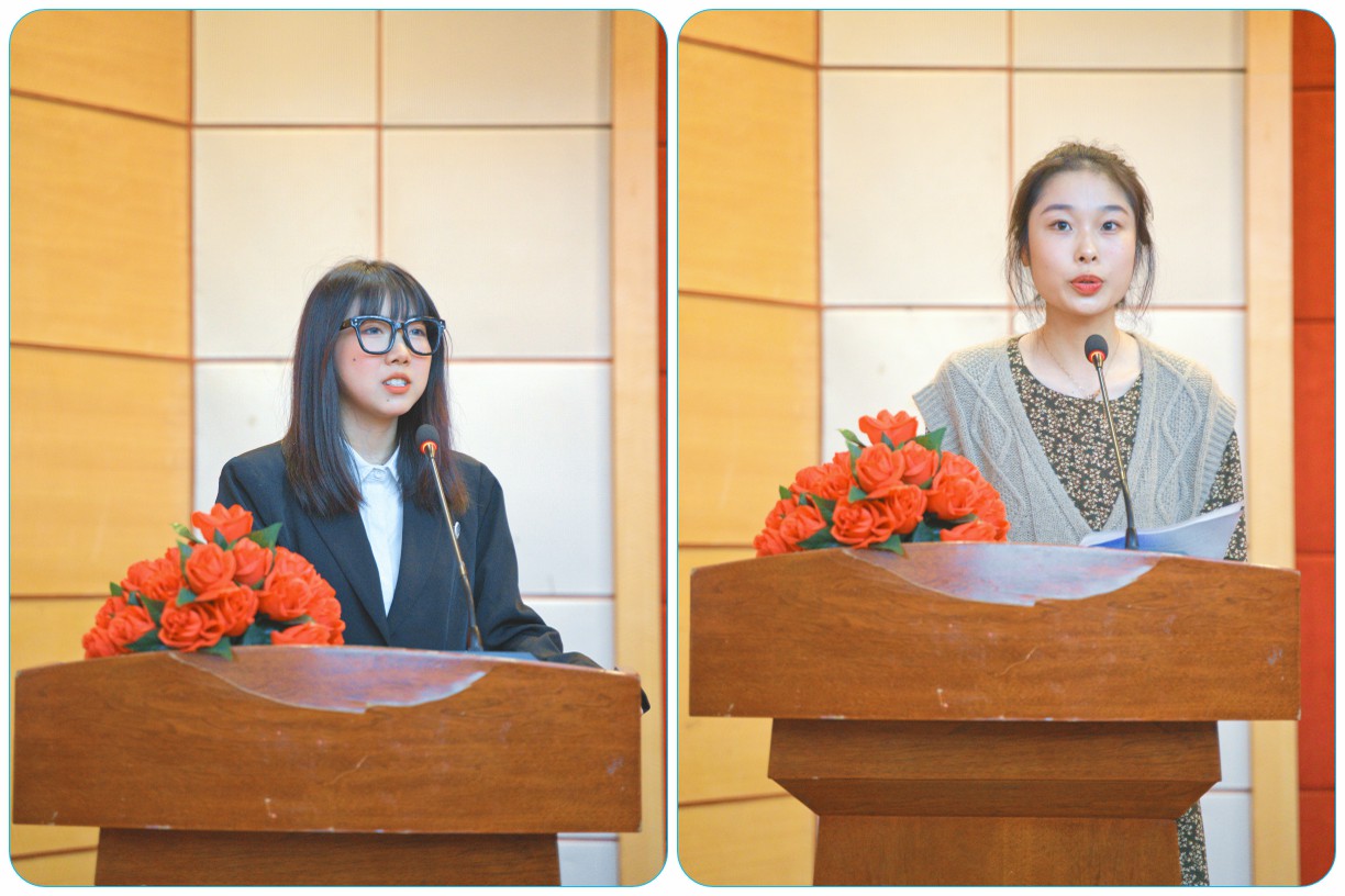 2019级洲际英才班的潘珊珊(左)同学、2020级洲际英才班的章证语(右)同学作为学生代表上台发言,展现了育英两届学生的风采与志气。