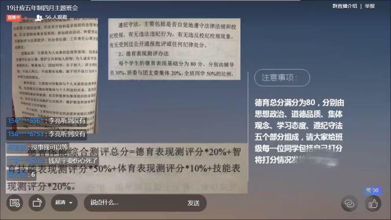 虽是疫情特殊期间,但学期的工作还是要照常开展,通过网络的主题班会,将目前开学至今班级的各项工作和同学们进行了大概的汇报,也让同学们了解了相关的事项,蒋玥老师着重对班级同学进行综合测评的讲解,将德育、智育、体育、技能的模块对班级同学进行了讲解,负责完成本班每位学生德智体能测评线上材料的收集、德育测评分的核算、等具体在网络层能够开展的各项工作,本着公平、公正、公开的原则,确保综合测评工作的正常开展。