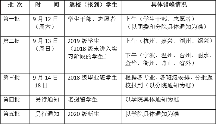 对按照“错区域、错层次、错时、错峰”的返校原则,老生返校和新生报到按5批次进行(新生报到、留学生返校时间另行通知),请同学们务必严格按照规定时间返校,未经批准不得提前返校,未经批准提前返校或强行来校的学生,根据相关规定严肃处理。