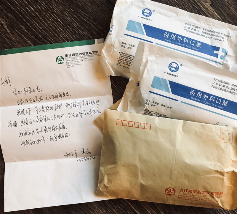 学院外事办还给两位同学寄去了口罩等防疫暖心包。随防疫暖心包一起寄去的还有谢鑫副院长亲笔书写的《慰问信》,字里行间表达了学院对海外学子的牵挂:“千万要做好个人防护,同时科学理性地看待疫情,合理安排学习和生活,祖国永远是你坚强的后盾,母校永远和你守望相助”。温暖熟悉的口吻让余静同学既吃惊又倍感暖心,于是在微信朋友圈里表达了激动之情:“在如此疫情之下收到了来自学校的物资,感动之情溢于言表,孤独的求学之路也不再无依无靠”。