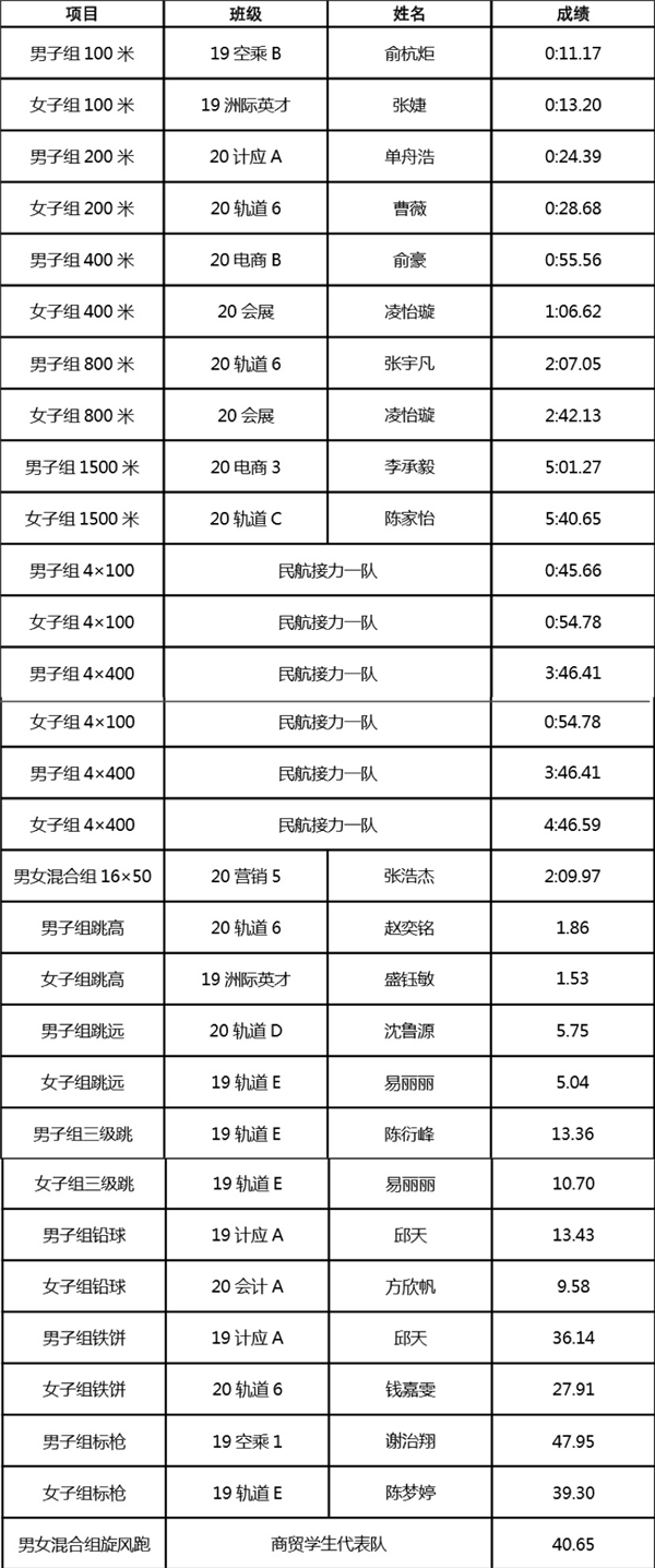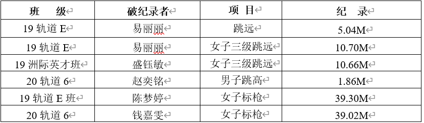 本届田径运动会中共6人次破学院田径运动会4项成绩纪录,参赛运动员表现出顽强拼搏的体育精神,取得了良好的运动成绩,赛出了精神,赛出了水平。