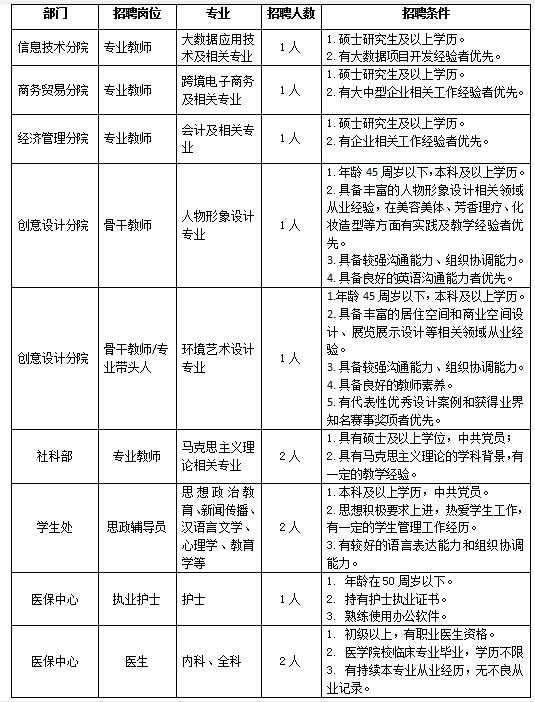 现因事业发展需要,诚聘认同我校办学理念,愿意投身高职教育事业、引领学生成长成才的优秀人才,具体要求如下:
