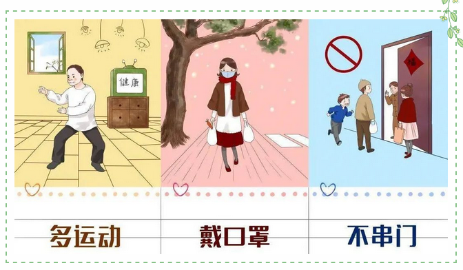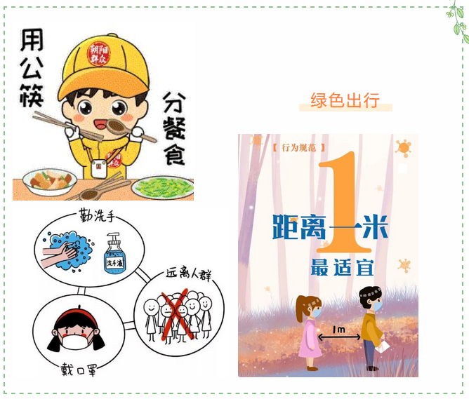 树立文明卫生意识,养成勤洗手、戴口罩、不随地吐痰、不乱扔垃圾好习惯。班级常通风、保持社交距离、倡导餐桌文明,推广分餐公筷,倡导绿色低碳出行,遵守交通规则,文明出行。