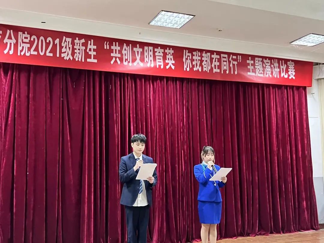 本次演讲比赛共有10位选手参加。比赛分为两轮:第一轮为主题演讲,在第一轮主题演讲中得分前六名的选手晋级第二轮的即兴演讲环节。主题演讲中选手们以“共创文明育英 你我都在同行”为演讲题目,进行了精彩的演讲。围绕建设文明校园,说出了自己的想法,各具特色。呼吁大家用自己的行动来共建我们美好的校园我们的“第二个家”。