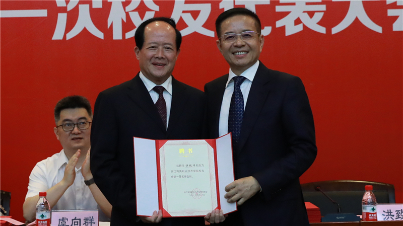 主席台领导颁发校友会名誉会长、常务理事、理事聘书。