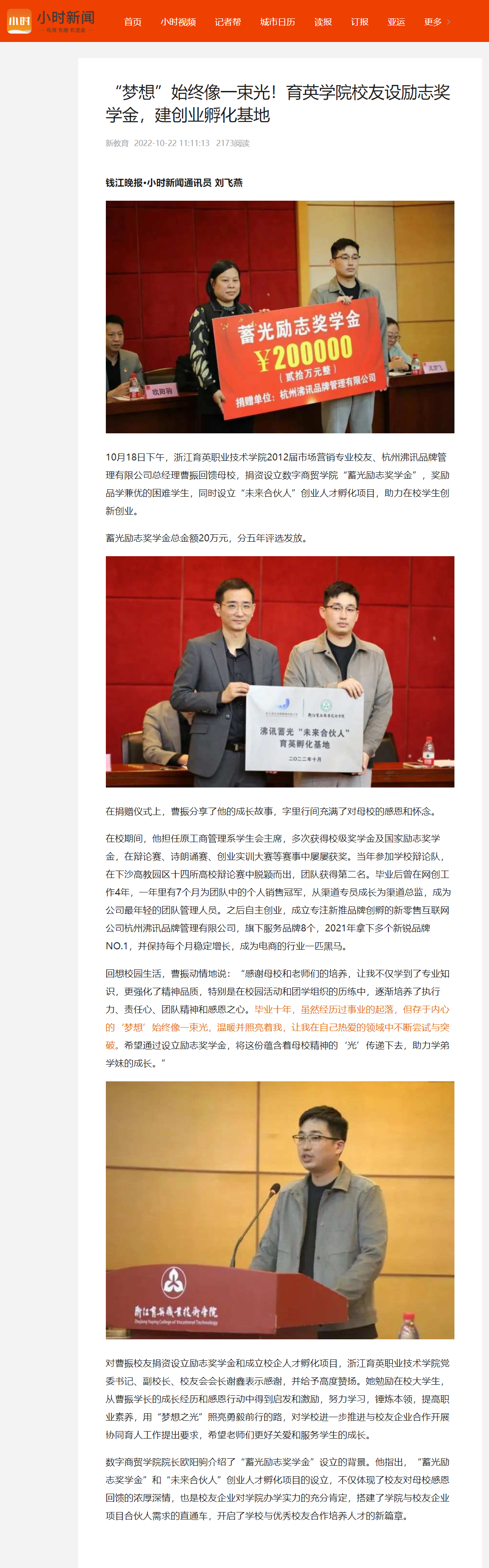 【钱江晚报小时新闻】“梦想”始终像一束光!育英学院校友设励志奖学金,建创业孵化基地