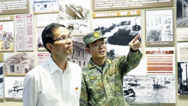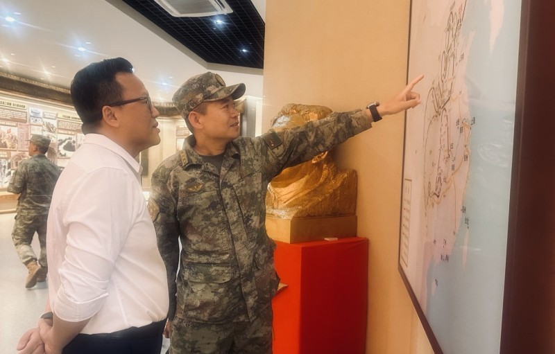 丁金昌一行在部队政委带领下参观了部队师史陈列馆。