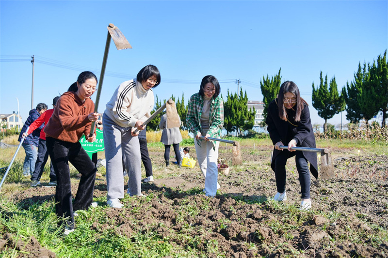 “编草鞋”只是第一步,第二关“除草开荒,种植蔬菜”则考验党员们的体力和耐力。在教育基地里,有两块杂草丛生的荒地,党员们拿起锄头、镰刀等各种农具,砍除杂草,挥舞锄头,翻新土地,现场一片热火朝天的劳动场景。随后,老师们在重整的土地上,种上了大蒜、萝卜、小青菜等蔬菜,瞬间荒地焕然一新,成为“育英南泥湾开垦地”。