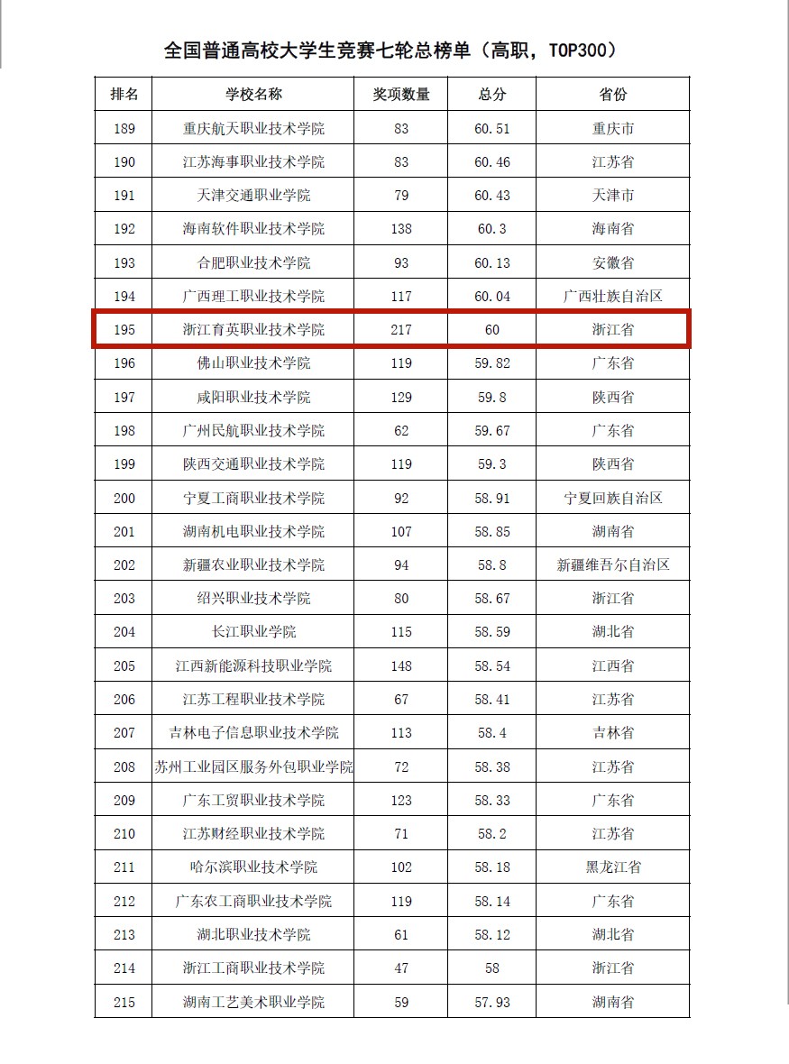另外,我校在其他类别的高职院校榜单排名中名次也逐年提升,在全国普通高校大学生竞赛七轮总榜单(高职,TOP300)位列全国第195名,浙江省第20名;在2018-2022年全国普通高校大学生竞赛榜单(高职,TOP300)位列70名,浙江省第9名;在2018-2022年全国一般高职院校大学生竞赛榜单(TOP100)位列第18名,浙江省第5名。