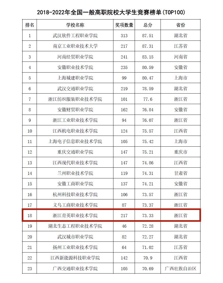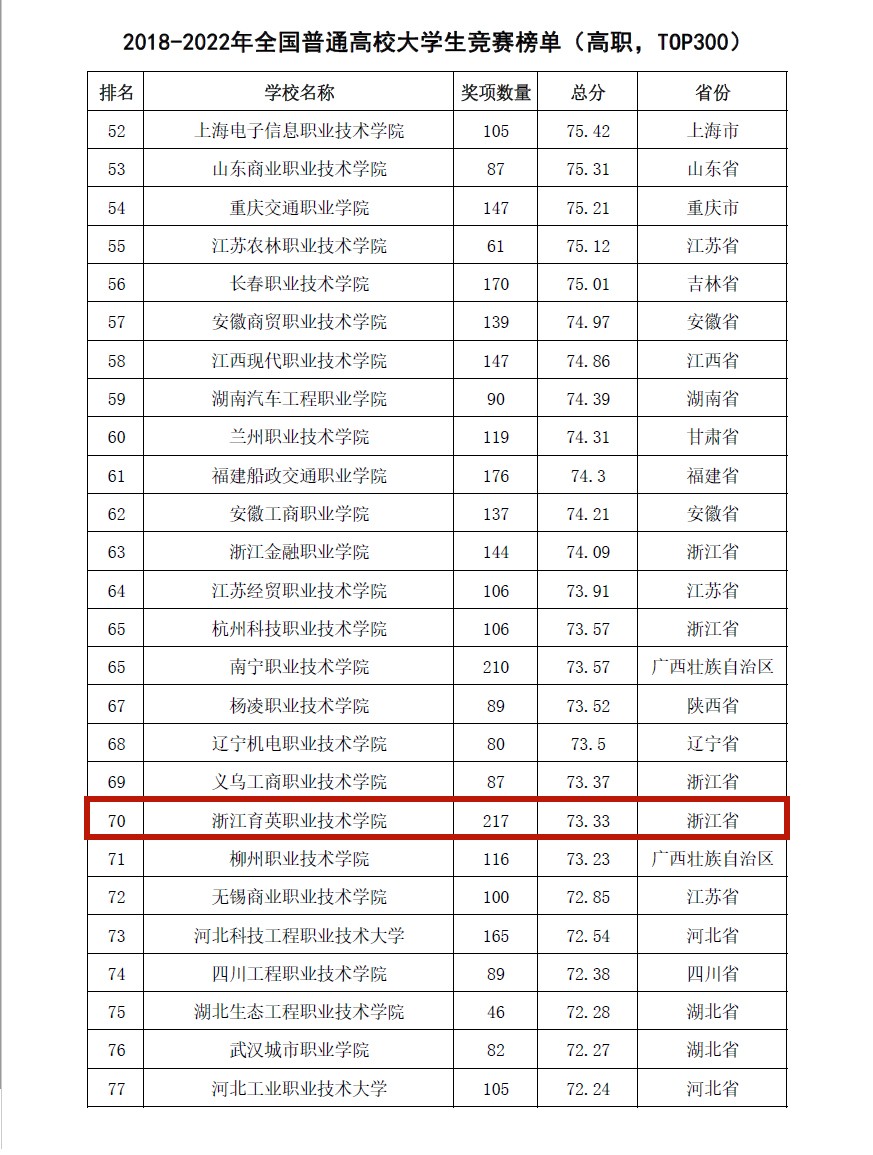 近日,中国高等教育学会高校竞赛评估与管理体系研究专家工作组发布《2022全国普通高校大学生竞赛分析报告》(以下简称《分析报告》)。我校在2022年全国普通高校大学生竞赛榜单(高职,TOP100)位列全国第25名,浙江省第5名;2018-2022年全国民办高职院校大学生竞赛榜单(TOP20)位列全国第2名,浙江省第1名。