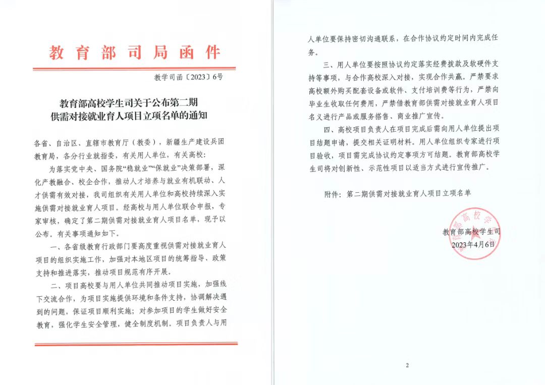 近日,教育部高校学生司发布《关于公布第二期供需对接就业育人项目立项名单的通知》(教学司函〔2023〕6号),我校10个供需对接就业育人项目获批立项,名单如下: