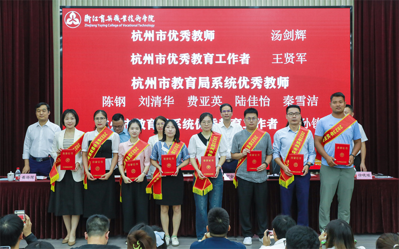 王敏宣读会议表彰文件。2023年度杭州市优秀教师等“二优秀一突出”典型、2023年浙江省高职院校教学能力比赛获奖团队、第十届“我最喜爱的老师”、第三届育英校友奖教金获奖教职工受到表彰。