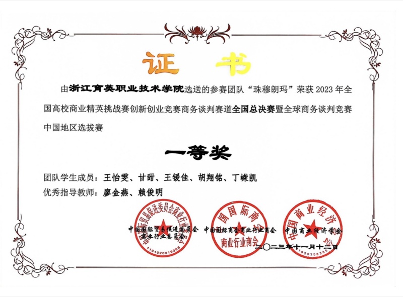 近日,我校数字商贸学院2022级市场营销专业学生王怡雯、甘甜、王锾佳、胡翔铭、丁嵘凯团队在2023年全国高校商业精英挑战赛创新创业竞赛商务谈判赛道全国总决赛斩获一等奖。这是我校自2021年参赛以来第三次获得一等奖。廖金燕、赖俊明获“优秀指导教师”称号。