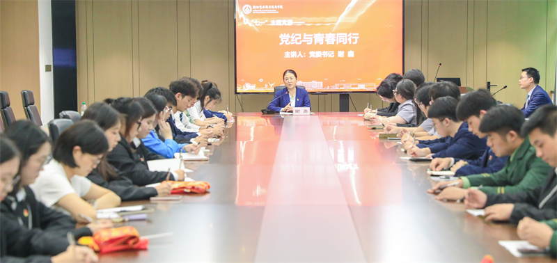 会议结束后,谢鑫在党员活动室为新发展的师生党员讲“党纪与青春同行”主题党课。