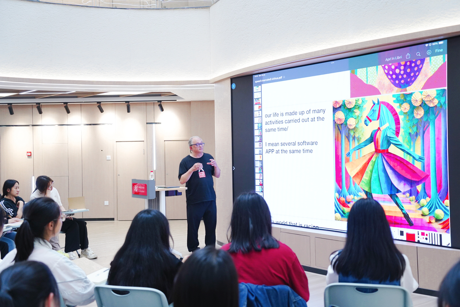 切萨雷教授结合自己的创作经历,鼓励同学们要时刻保持创作的“饥饿感”,好奇心是做好创意设计工作的必备,而保持好奇心的重要方法就是对生活投入热爱、投入关注力,要擅于探究新问题,勇于尝试新技术、新方法。他向同学们介绍了自己的日常创作习惯并展示了大量有趣的创意作品,深刻诠释了创意源于生活、源于实践的道理。