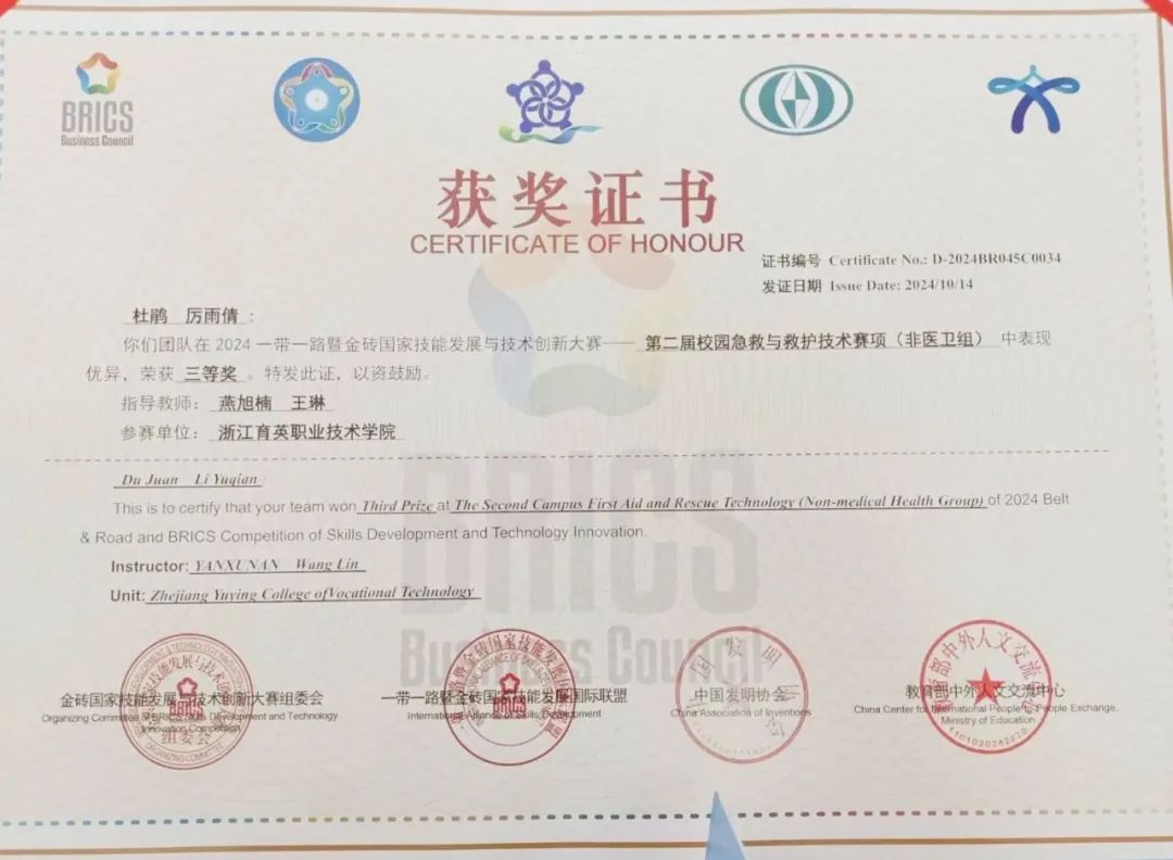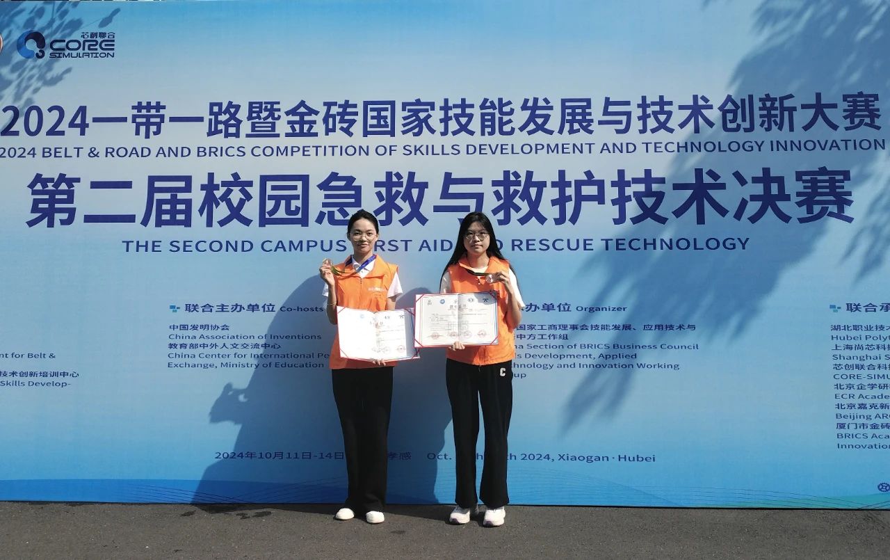 10月11日至13日,2024一带一路暨金砖国家技能发展与技术创新大赛第二届校园急救与救护技术决赛在湖北职业技术学院举行。我校民航交通学院城市轨道交通专业(匠心班)学员厉雨倩、杜鹃获得国赛三等奖。指导教师燕旭楠、王琳。