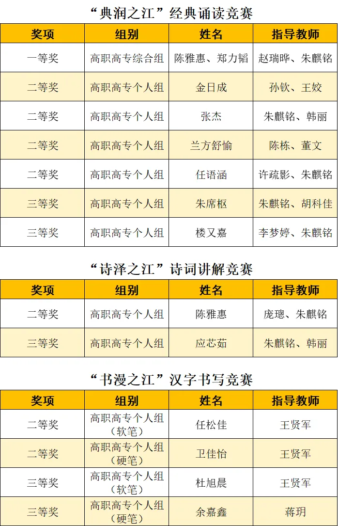 近日,浙江省第十二届大学生中华经典诵写讲大赛圆满落幕,我校在“典润之江”经典诵读、“诗泽之江”诗词讲解、“书漫之江”汉字书写三项赛事中共获省级一等奖1项,二等奖7项,三等奖5项。其中作品《等待》在“典润之江”经典诵读赛项中脱颖而出,入选国赛。