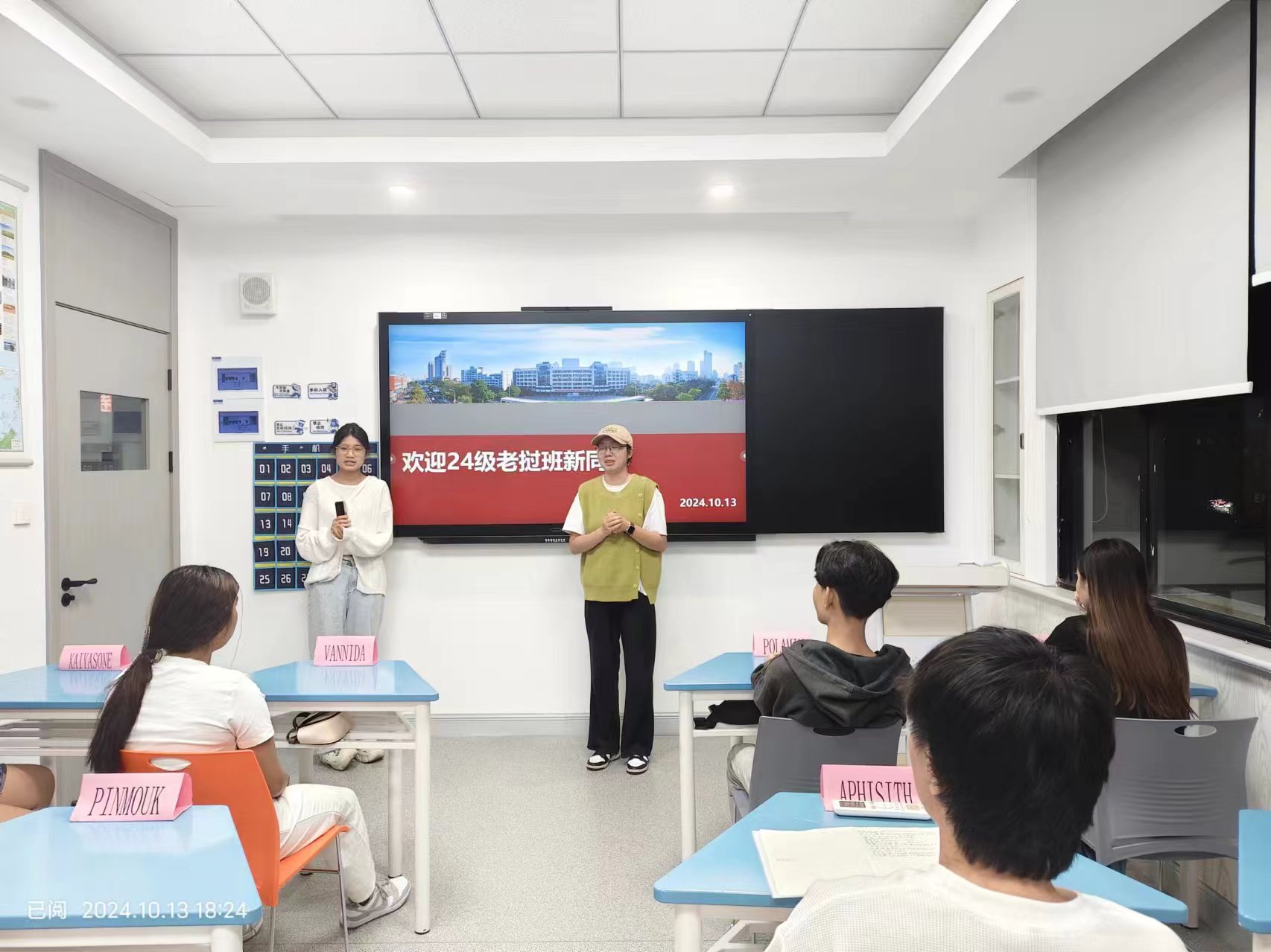 辅导员董文老师以“友谊桥梁,共绘未来”为主题,开展了主题班会,旨在促进新老生之间的交流与融合。班会上董文老师首先介绍了语伴计划,鼓励老挝新生与中国同学结对子,共同学习、共同进步。随后,语伴们纷纷上台进行自我介绍,分享了彼此的兴趣爱好与未来规划。此外,董文老师还详细讲解了学校的规章制度,帮助老挝新生更快地适应校园生活。这场主题班会不仅增进了新老生之间的友谊,更为他们共同绘制了一幅多彩的未来画卷。
