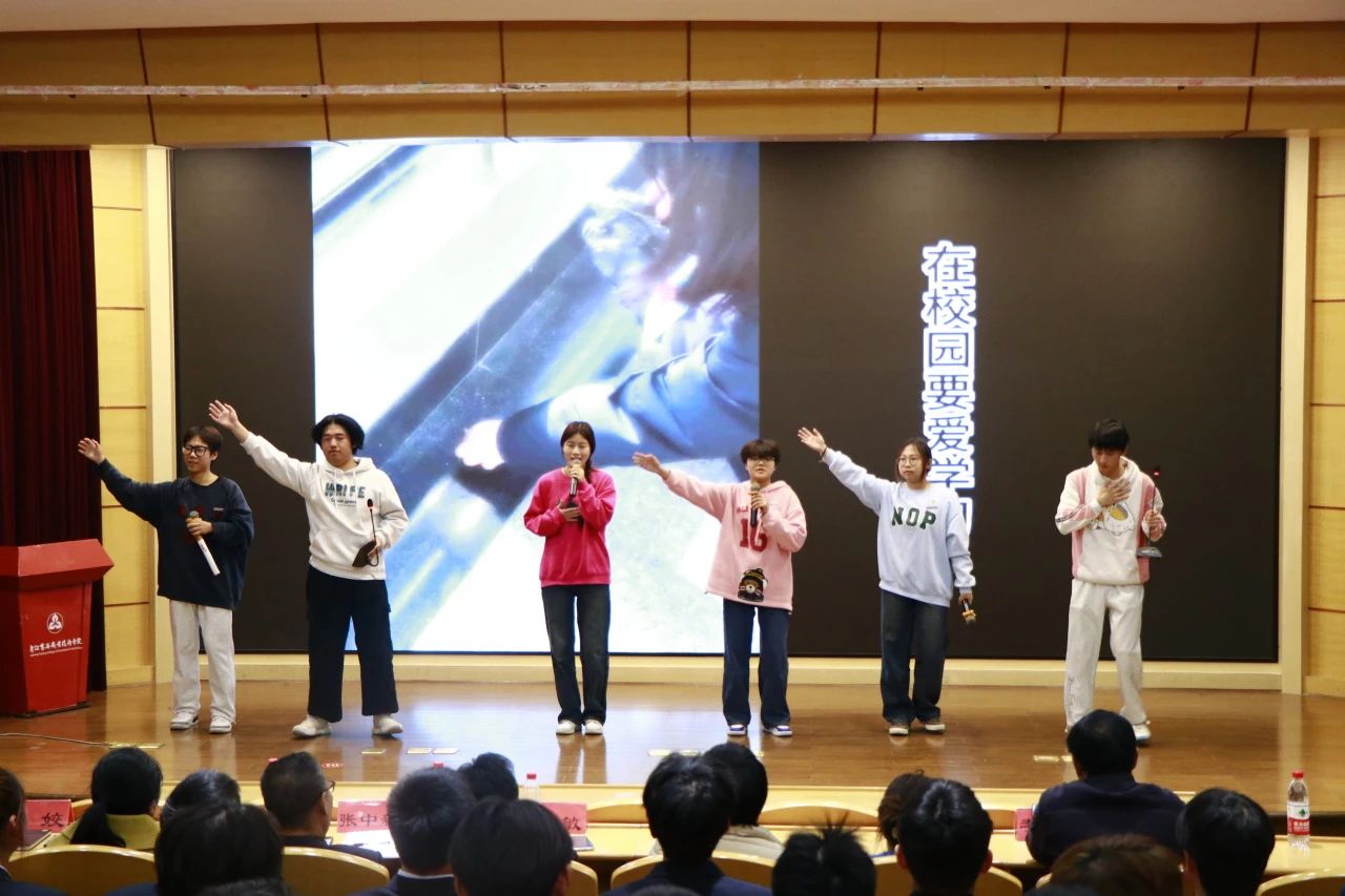 本次班会主题为“无烟校园改造计划”,分成“可行性分析”“原型设计”“功能测试”“成果验收”四个精心设计的创意篇章,通过情景剧演绎、问卷调查与分享、医务室医生授课、知识竞赛比拼、海报设计创意、集体倡议、歌舞表演等大学生喜闻乐见的方式,充分结合数字技术的专业技能和优势,巧妙运用当下最热门的AI技术绘图、并与参与人员互动,为主题班会注入了时尚的元素和生动的趣味。班会过程中,既有医务室医生的专业科学的讲解、数据和案例,又有同学们带来的耳目一新的默剧表演、用心改编歌词的演唱;既有有理有据的数据、观点展示,又有启发式的思考、分享,全体同学积极协作、踊跃参与、配合默契,现场氛围热情。